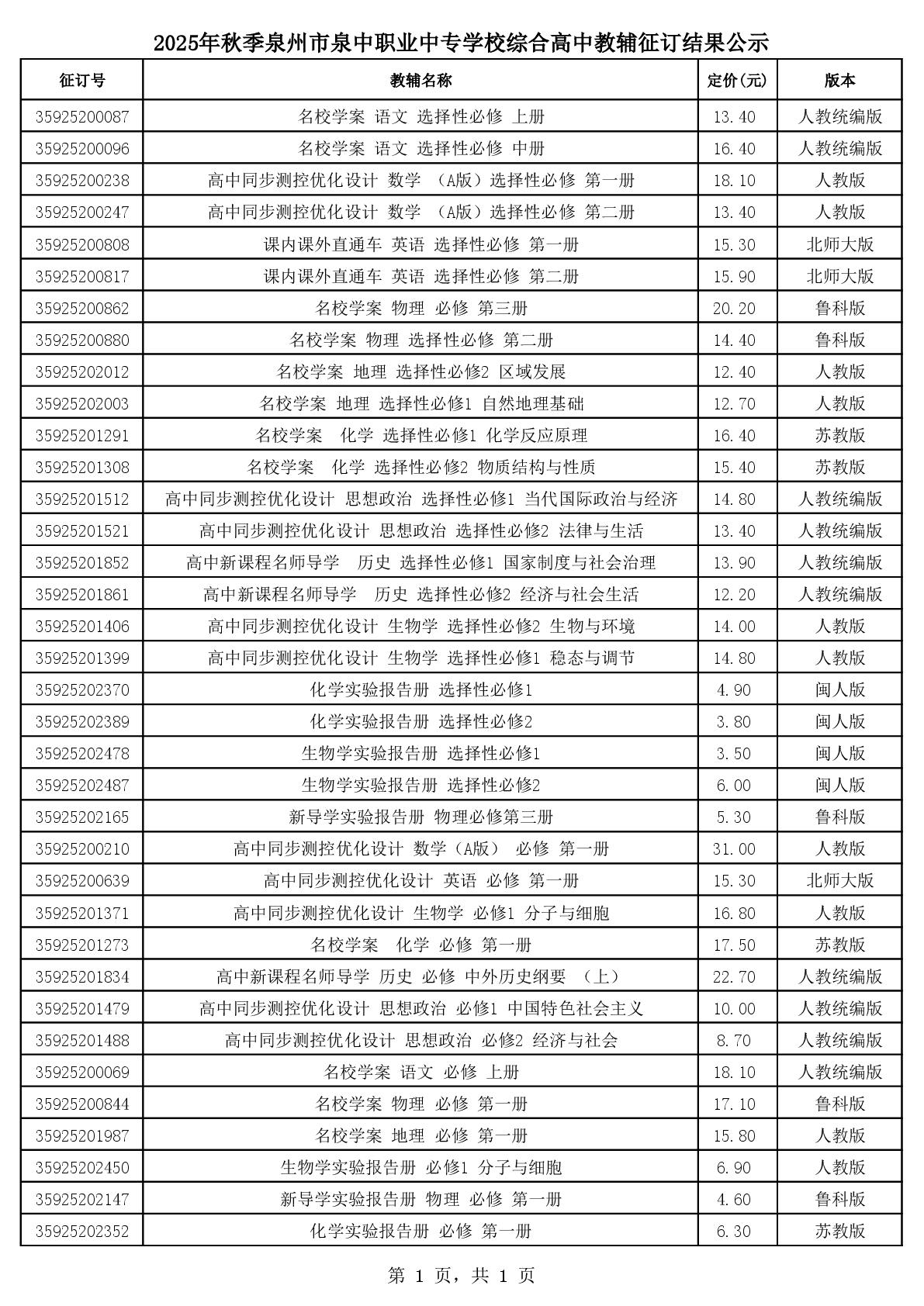 2025秋泉州市泉中职业中专学校高中教辅征订结果公示