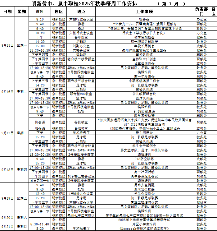 【09月15日 星期一】 2025年秋季第03周工作安排
